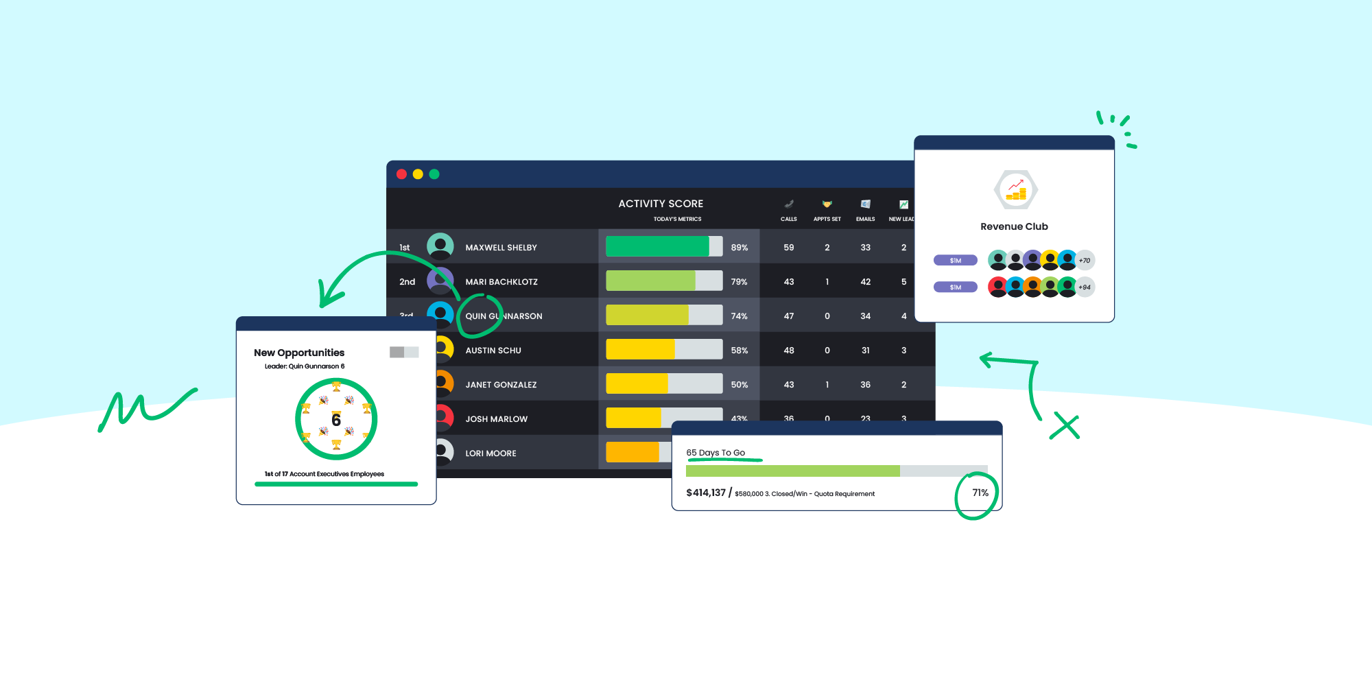 Ambition’s sales dashboard integration with Salesforce can allow sales leaders to connect their users, data, fields, and more from the CRM to the sales dashboard with just a few clicks. Integrating an effective sales performance dashboard could help sales managers create more transparency and visibility around their sales metrics.