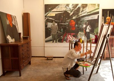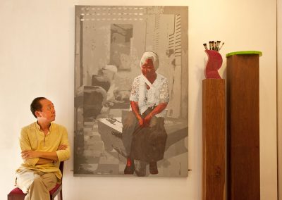 He has created a new aesthetic, drawing and paintings on both Khmer tradition and contemporary international designs hoping to breathe new life into Cambodian handicrafts. For more than 12 years Theam was the technical assistant and artistic director of Artisans d’Angkor, he then has launched a new creative project – Theam’s Gallery – that includes training a team of protégé artisan apprentices while he embarks on a new creative journey of his own painting.