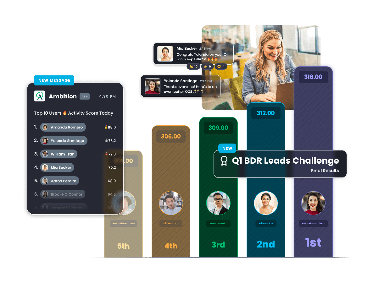 Fire up your sales team and keep upping the ante with contests you can draft and deploy in just a few clicks. Ambition automatically tracks and reports standings for call raffles, activity blitzes, objection bingo, team vs. team competitions, and more, in real-time. Plus! Competition standings are summarized by AI in the manager brief.